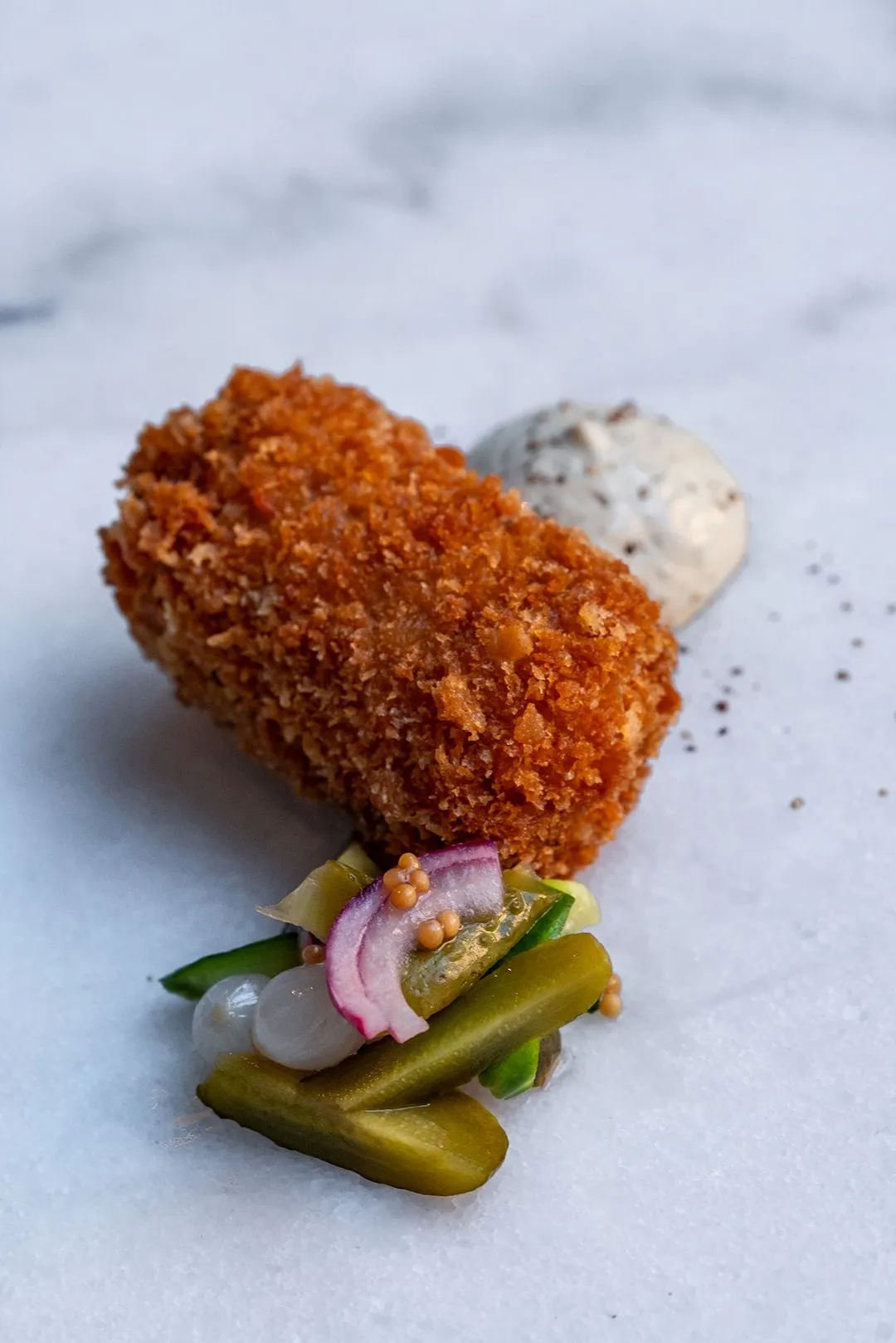 The beef used for the salpicon of this croquette is nicely selected shoulder cuts, slowly cooked in a powerful oxtail broth. The power of our meat croquette is enhanced by a combination of truffle mayonnaise and fresh pickle mix.